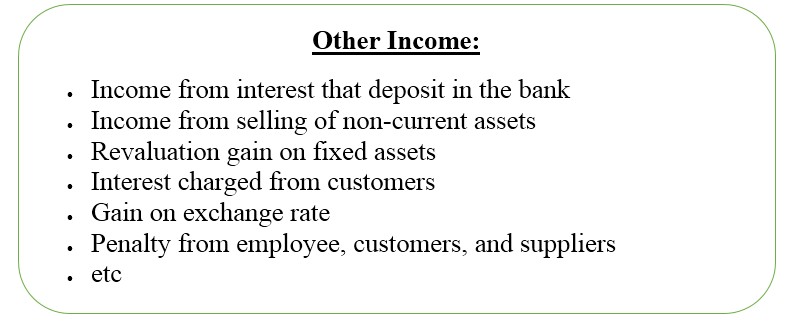 Those incomes included a gain on disposal of assets, gain on revaluation of assets, interest incomes from sales on credit which is overdue, interest from the savings account, interest from fixed deposit, and similar kinds.
